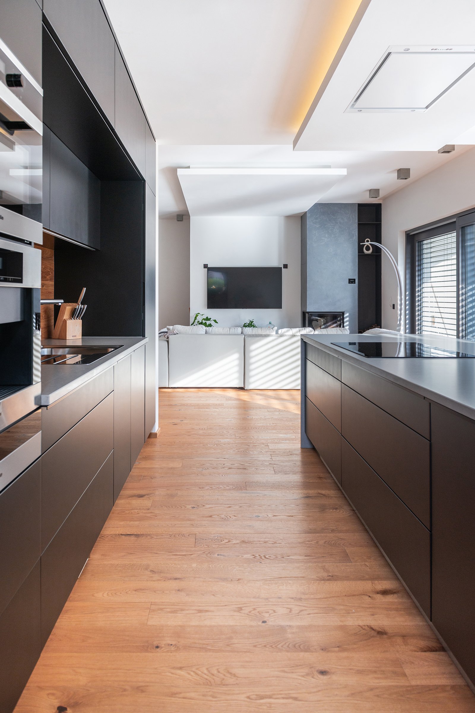 Pojďte se s námi podívat do kuchyně od designéra Tomáše Grulicha a pokochat se odstíny šedé a grafitu, které patří k nejoblíbenějším barevným trendům současnosti. Uvidíte tmavé hranové úchytky, a především otevřené niky, které jsou výraznou dominantou interiéru a opticky rozbíjí mohutné nábytkové kusy. Kuchyně má tvar L a doplňují ji vysoké technické skříňky až ke stropu. Skrývají v sobě lednici, potravinovou skříň a velmi šikovně i 3 vestavné spotřebiče. Zádový obklad jsme vyrobili z tvrzeného kaleného skla (které byste mohli mít i ve své kuchyni v jakékoliv barvě nebo grafice).