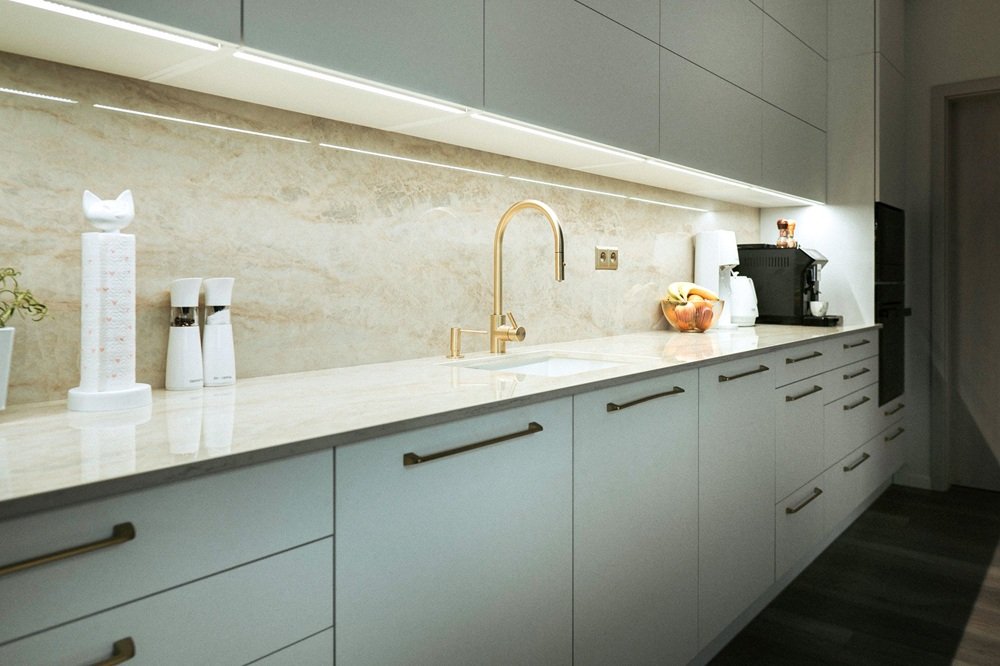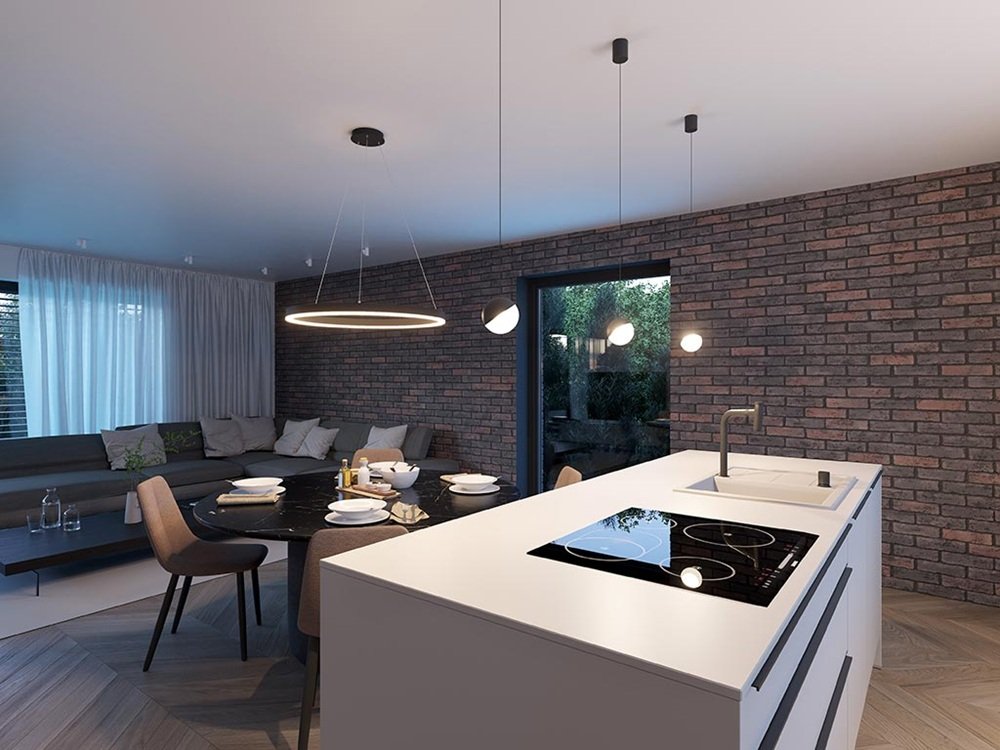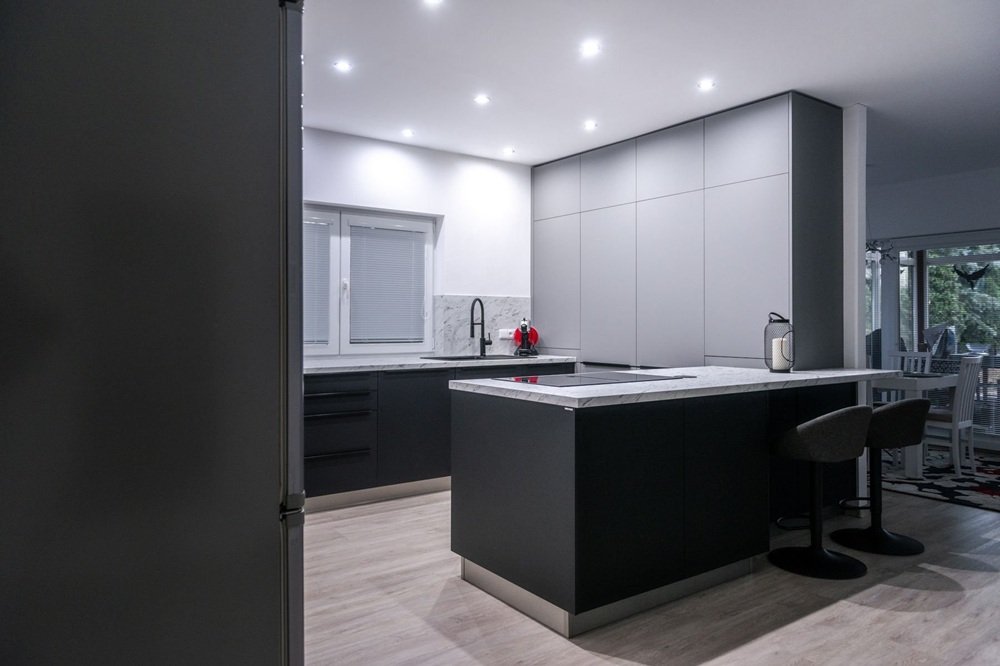 Při návrhu kuchyně myslíme i na osvětlení, protože právě zde hraje klíčovou roli. Kvalitní pracovní světlo nad linkou je nezbytné pro bezpečnou přípravu pokrmů, zatímco atmosférické osvětlení nad jídelním stolem nebo barovým pultem vytváří příjemné prostředí pro společné stolování. V moderních kuchyních s ostrůvkem se skvěle uplatní závěsná svítidla, která nejen osvětlí pracovní plochu, ale stanou se i výrazným designovým prvkem celého prostoru. LED pásky pod horními skříňkami pak zajistí rovnoměrné nasvícení pracovní desky bez nepříjemných stínů.